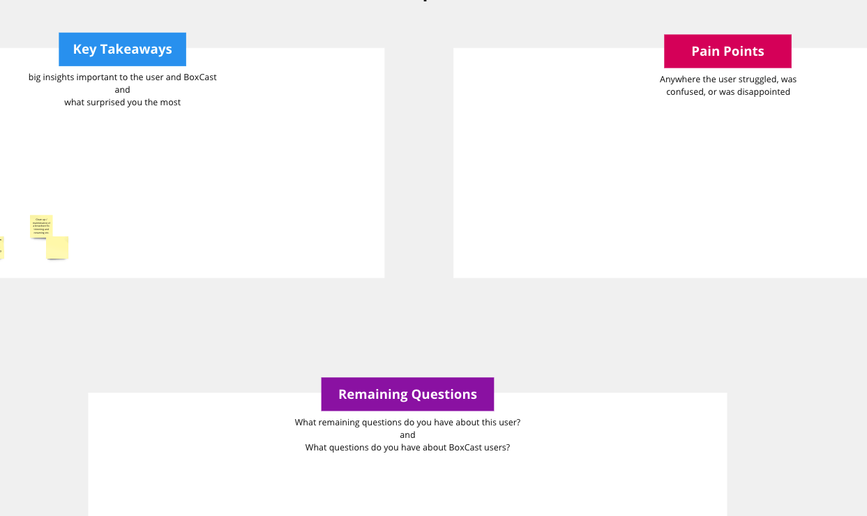 Collaboration whiteboard used for a UX Watch Party where people watch a research session and discuss afterward