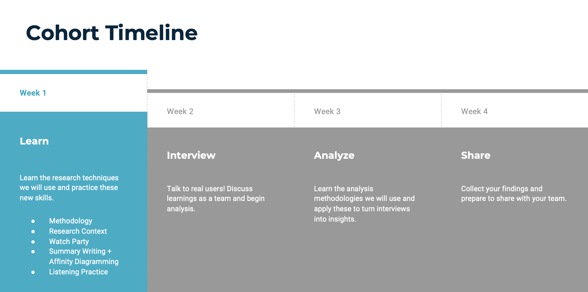 A hands-on, one month, project-based learning experience where participants conduct real interviews, synthesize findings, and present insights.Project-Based Experiential Learning